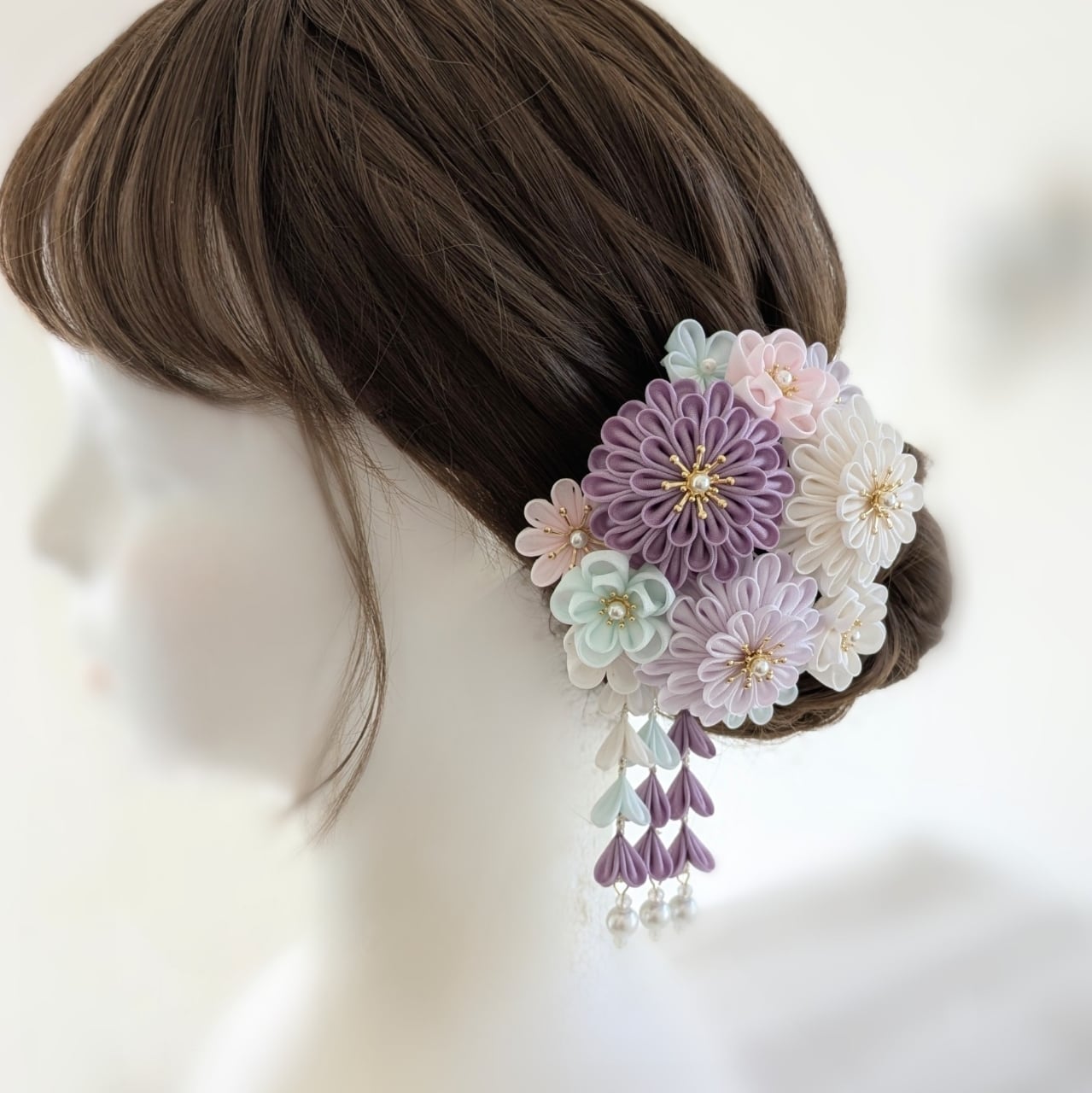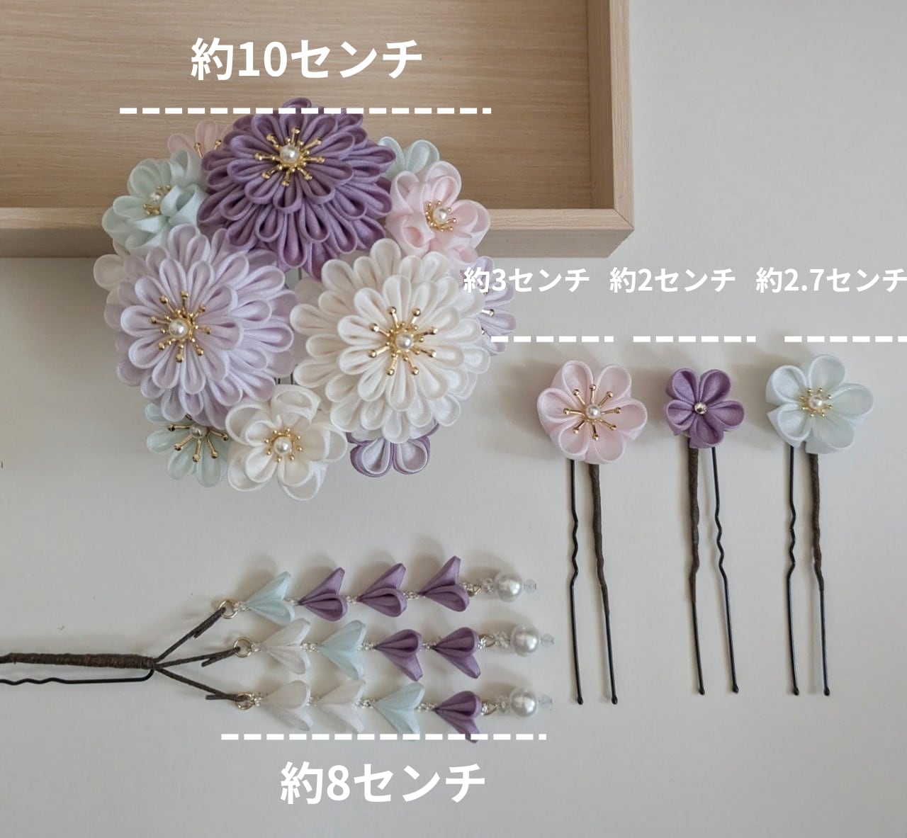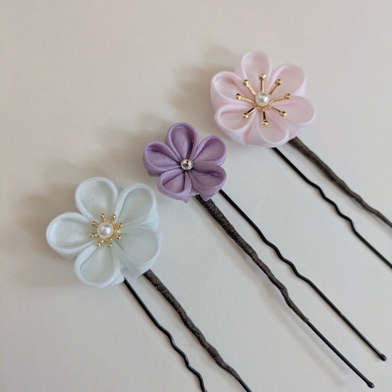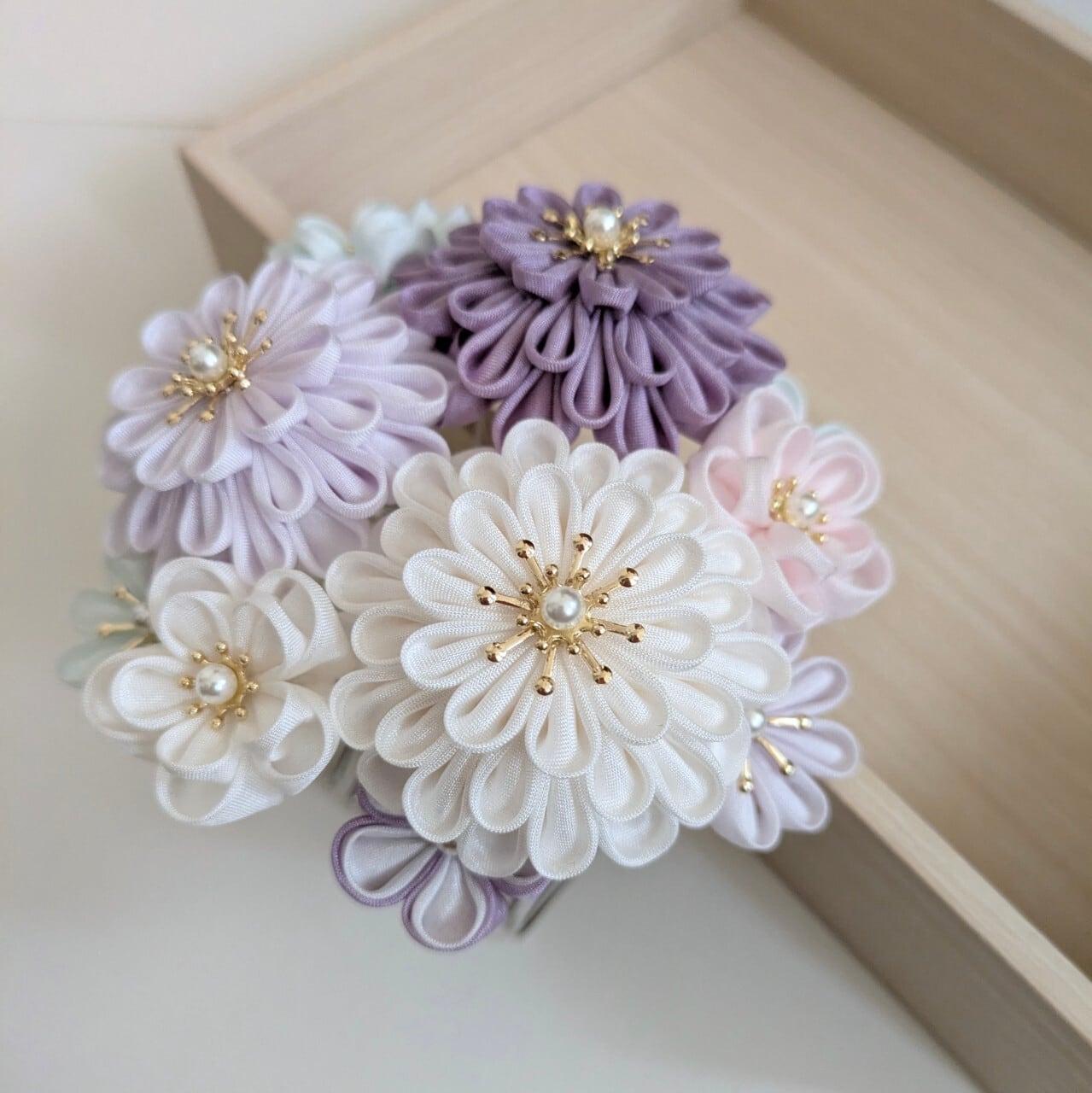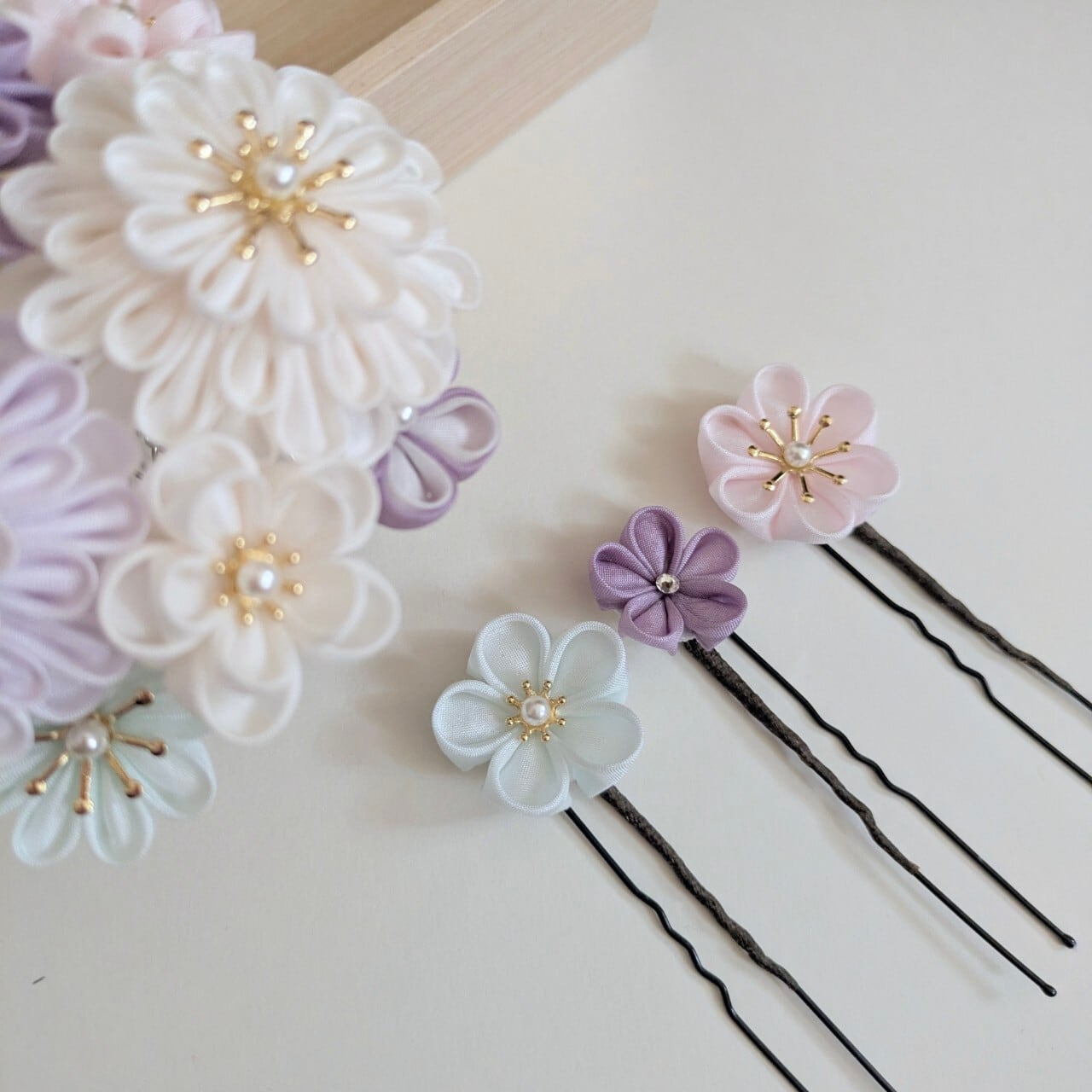 コロンとした形が可愛い雰囲気つまみ細工の髪飾りセットです。